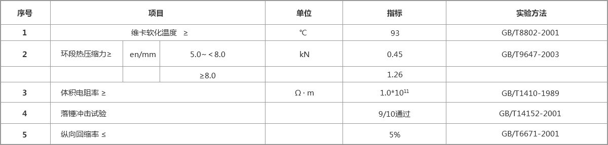 PVC-C樹(shù)脂為母料,該產(chǎn)品具有強(qiáng)度高、柔韌性好、耐高溫、耐腐蝕、阻燃、絕綠性能良好、不易老化、質(zhì)輕、施工方便等特點(diǎn),其各項(xiàng)性能指標(biāo)經(jīng)國(guó)家級(jí)、省檢測(cè)、鑒定和認(rèn)證,均已達(dá)到或超過(guò)國(guó)內(nèi)的同類(lèi)產(chǎn)品水平。產(chǎn)品性能大優(yōu)于傳統(tǒng)的石棉電纜排管及普通PVC管材,是傳統(tǒng)電力電纜護(hù)套管的理想替代品。